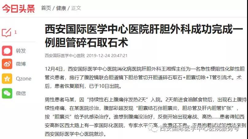 12月4日,西安國際醫(yī)學中心醫(yī)院消化病醫(yī)院肝膽外科王湘輝主任為一名急性梗阻性化膿性膽管炎患者,施行了腹腔鏡聯(lián)合膽道鏡下膽總管切開膽道碎石取石 膽囊切除 T管引流術(shù)。術(shù)后,患者恢復良好,于10日出院。