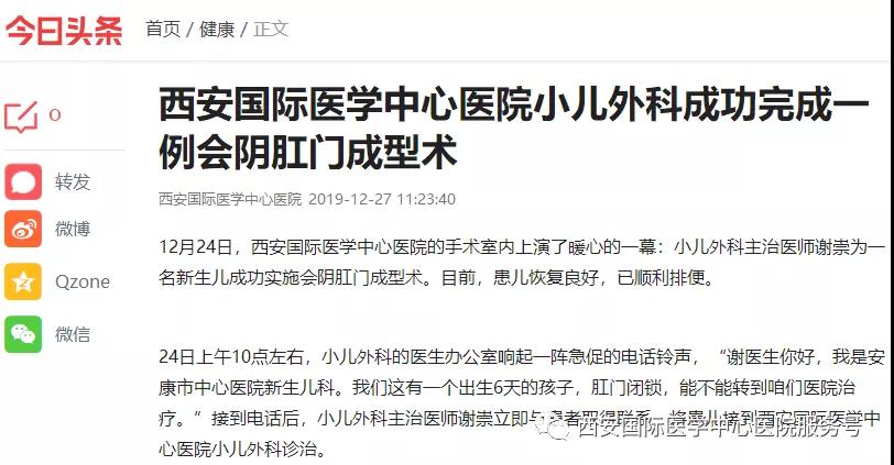 12月24日,西安國際醫(yī)學中心醫(yī)院的手術(shù)室內(nèi)上演了暖心的一幕:小兒外科主治醫(yī)師謝崇為一名新生兒成功實施會陰肛門成型術(shù)。目前,患兒恢復良好,已順利排便。