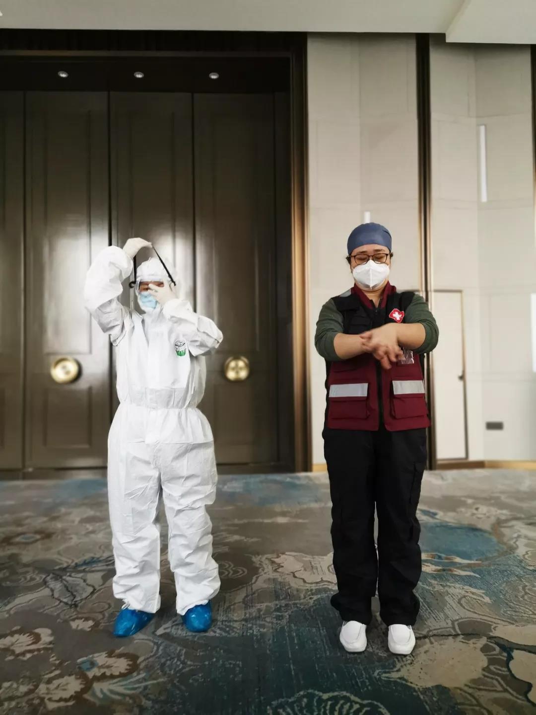 晚上十點(diǎn)多,大家仍然在反復(fù)溫習(xí)筆記,不斷練習(xí)穿脫防護(hù)服。穿防護(hù)服:十五個左右的步驟;脫防護(hù)服:二十多個步驟。每一個重要動作要練習(xí)上百次,穿脫幾次后,往往汗流浹背。