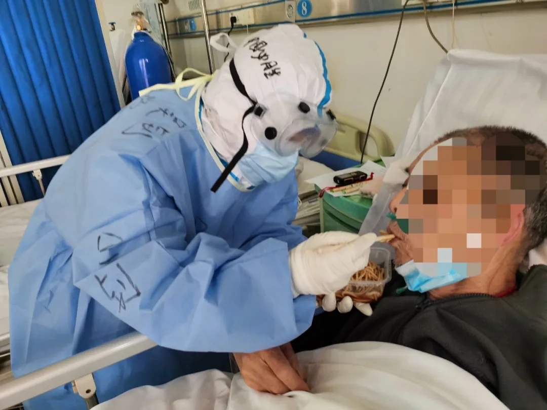 印象最深的是一個(gè)八十多歲的老爺爺在我們所管的病區(qū)住院,他除了新冠肺炎還有高血壓、偏癱的癥狀。他的老伴也八十多歲了,一直在這守護(hù)著他,照顧著他,老奶奶耳朵也有點(diǎn)背,嗓門很大,經(jīng)常問我們藥怎么吃,我們都耐心的解釋。我的搭檔吳釗要給別的患者泡牛奶,都是找這個(gè)熱心的老奶奶幫忙試水的溫度。我們幫隔壁床的患者翻身,換床單,她也過來給我們幫忙,還時(shí)常說我們好。有時(shí)候要扶老爺爺起來,我們要給幫忙,她總是不要我們幫忙,讓人很心疼。我想,老奶奶沒日沒夜的伺候著老伴,應(yīng)該是害怕失去吧,希望老爺子趕快好起來。