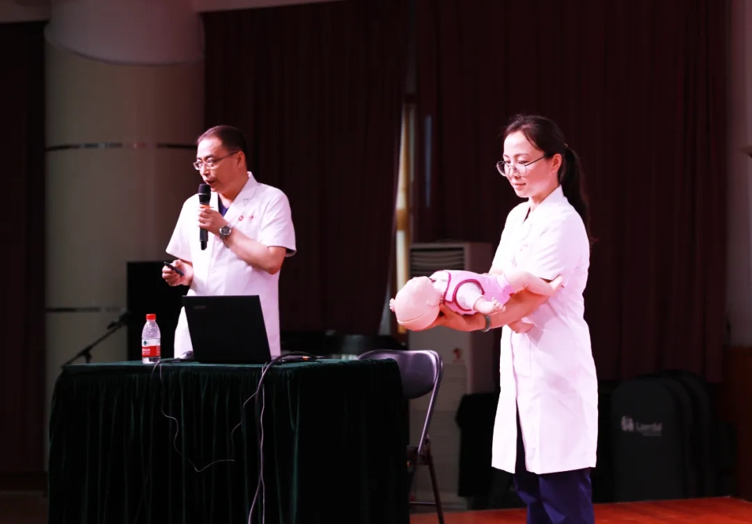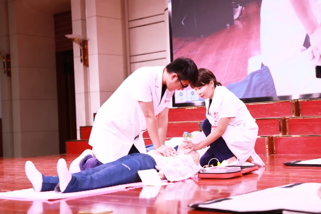 在多功能廳,王彬榮副主任進(jìn)行理論授課;呂玉珠醫(yī)生、張榮榮護(hù)士長(zhǎng)、許哈克分別進(jìn)行了成人、兒童、嬰兒心肺復(fù)蘇術(shù)(CPR)模擬演練、體外自動(dòng)除顫器(AED)的使用、海姆立克法、嬰兒氣道梗阻的緊急處理方法等操作演示,并以互動(dòng)的方式邀請(qǐng)12名學(xué)生代表上臺(tái)進(jìn)行了操作練習(xí),老師們現(xiàn)場(chǎng)進(jìn)行一對(duì)一的指導(dǎo),為大家解答各種疑問,使他們對(duì)現(xiàn)場(chǎng)心肺復(fù)蘇術(shù)的全過程有了更加深刻的理解,也使學(xué)生們基本掌握了心肺復(fù)蘇法的操作技能。