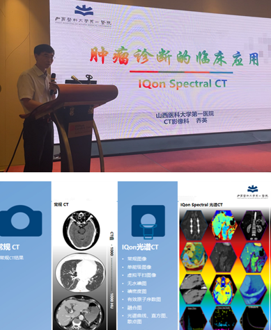 授牌儀式后即開始精彩的學(xué)術(shù)講座,首先,山西醫(yī)科大學(xué)第一醫(yī)院影像科喬英教授分享了“IQon光譜CT在腫瘤診斷的臨床應(yīng)用”。喬教授指出IQon Spectral CT的光譜重建可以提供多參數(shù)數(shù)據(jù),如單能級圖像、無水碘圖、有效原子序數(shù)值等,更加清晰的觀察病灶范圍,更加精準(zhǔn)的發(fā)現(xiàn)小病灶、進(jìn)行腫瘤分期及術(shù)后療效評估。