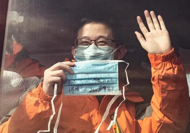 攝影作品《醫(yī)生》內(nèi)容為2020年2月3日,西安國(guó)際醫(yī)學(xué)中心醫(yī)院赴武漢醫(yī)療隊(duì)的出征現(xiàn)場(chǎng),一位即將出發(fā)的醫(yī)生展示寫滿科室同事名字和祝福的口罩。該作品由西安報(bào)業(yè)集團(tuán)攝影記者竇翊明拍攝。