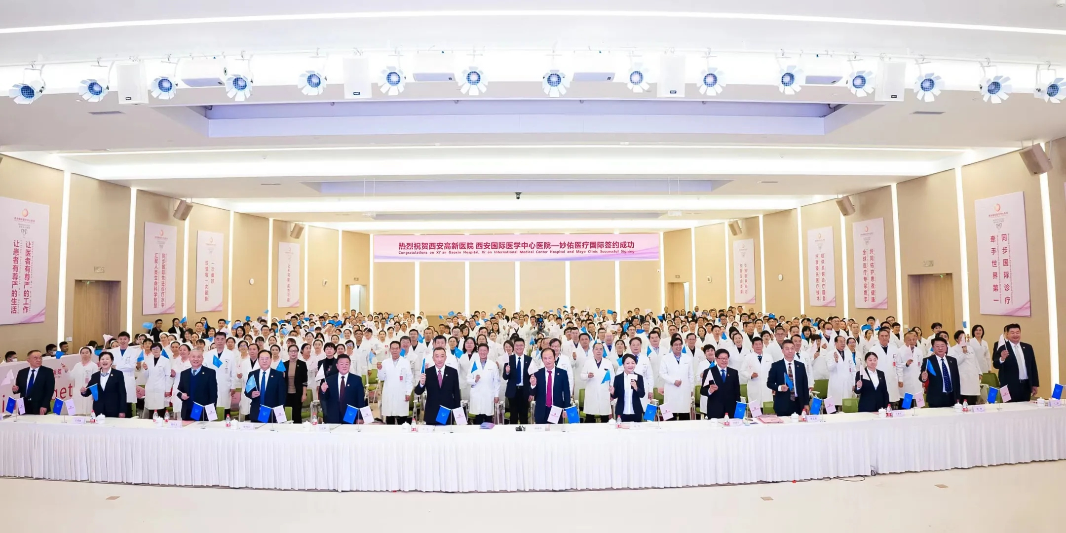 儀式上,妙佑醫(yī)療國際(Mayo Clinic)醫(yī)療執(zhí)行總監(jiān)思迪絲?瑞扎與西安國際醫(yī)學(xué)中心醫(yī)院院長尹強(qiáng)、西安高新醫(yī)院院長宋瑛共同簽署合作協(xié)議,并將聯(lián)盟醫(yī)院水晶杯授予兩家醫(yī)院。