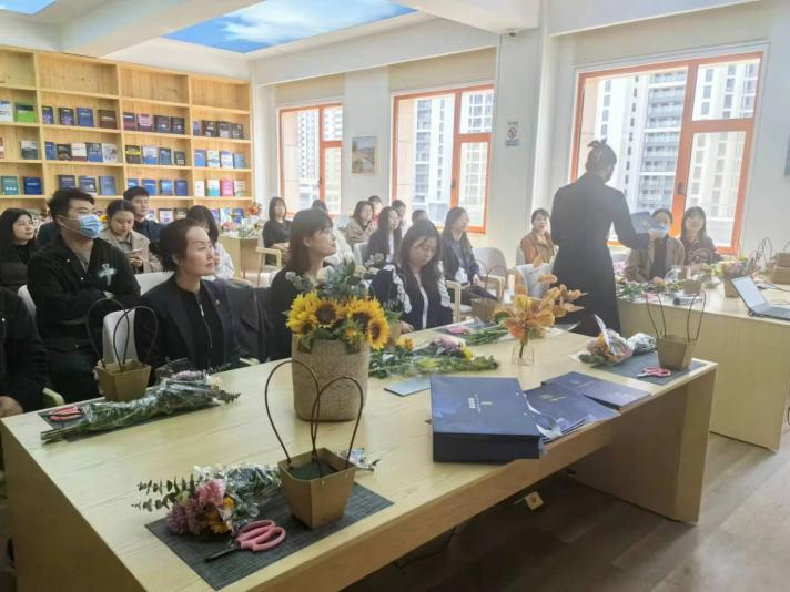 活動特邀了專業(yè)的花藝?yán)蠋?,現(xiàn)場為大家進行講解和指導(dǎo)。花藝?yán)蠋熢敿?xì)講解了各種花卉所蘊含的花語及插花技巧,大家發(fā)揮想象力,用自己靈巧的雙手,將經(jīng)過修剪的向日葵、非洲菊、康乃馨等多種花材,根據(jù)不同的色彩、形狀有層次地搭配在一起,在馥郁花香中感悟取舍之道、領(lǐng)會古雅之美。