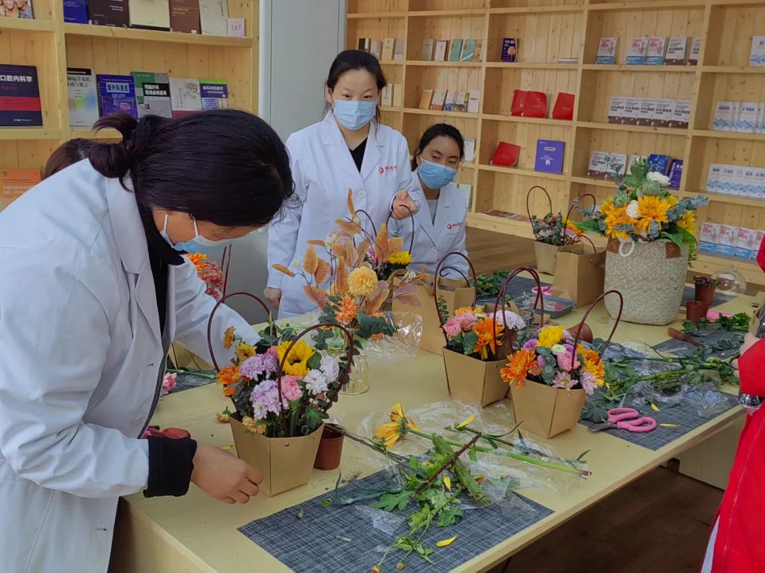 在插花過程中,每個人臉上都洋溢著幸??鞓返男θ?,在插花勞作中尋找樂趣,從作品欣賞中獲得滿足,在相互交流中拉近距離。五顏六色的花材在大家手中被賦予了新的生命和寓意,呈現(xiàn)出一件件清新怡人的花藝作品。此刻,無論媽媽、妻子、女兒,還是醫(yī)生、護士,雖然角色不一樣,但都沉浸在專注花藝的體驗中。